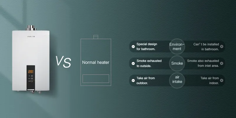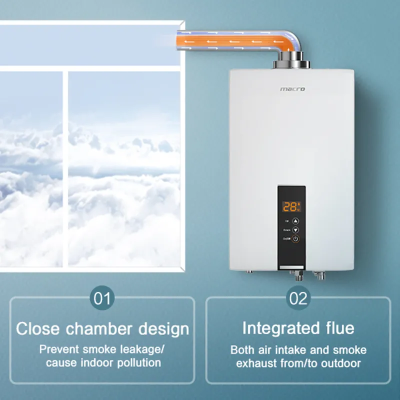 Um aquecedor de água a gás forçado usa um ventilador para esgotar gases de combustão para o exterior. Requer uma combustão de escape conectada ao exterior. Por outro lado, um aquecedor de água a gás do tipo equilíbrio possui uma câmara de combustão selada. Ele atrai o ar externo para combustão e esgota gases do lado de fora através de uma combustão coaxial. Isso o torna mais seguro para a instalação em áreas com ventilação limitada, pois não consome o ar interno para combustão.