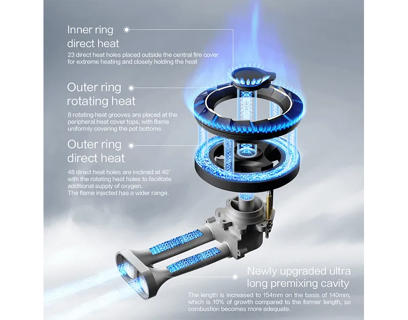 O queimador de chama uniforme recém -atualizado para travar a frescura, com anel interno aquecido por fogo direto e anel externo aquecido pelo fogo rotativo.