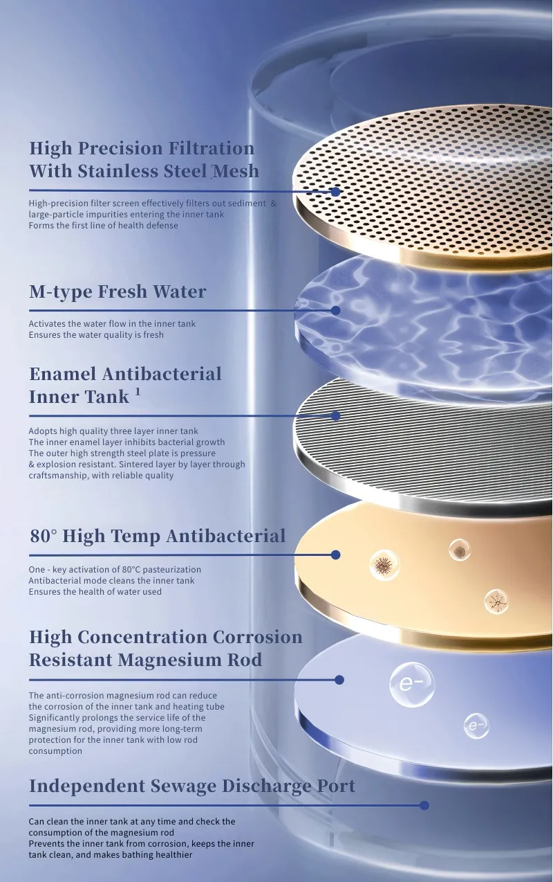 O controle inteligente está ao seu alcance com conectividade Wi-Fi e um painel sensível ao toque, permitindo ajustes remotos de temperatura (30-75 ° C), programação e monitoramento em tempo real via smartphone. O sistema de purificação de 6 estágios garante água mais limpa, combinando uma haste de magnésio de alta pureza, tanque interno revestido com esmalte 3D, esterilização de alta temperatura (antibacteriana 99%) e um projeto de fluxo de água em forma de M para minimizar o acúmulo de sedimentos. Uma porta de drenagem independente simplifica a manutenção.