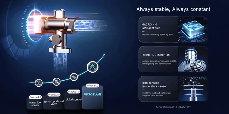 Integrado aos 3 componentes de controle do núcleo, realizar a correspondência ideal de gás e água, com controle precisamente estático e dinâmico, mantenha a água quente sempre estável.