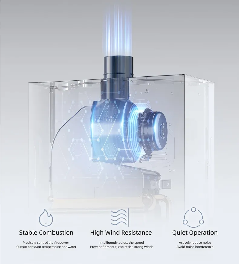 Equipado com um ventilador de frequência variável CC, ele pode ajustar de forma inteligente a velocidade do ventilador, garantindo uma combustão suficiente e estável.