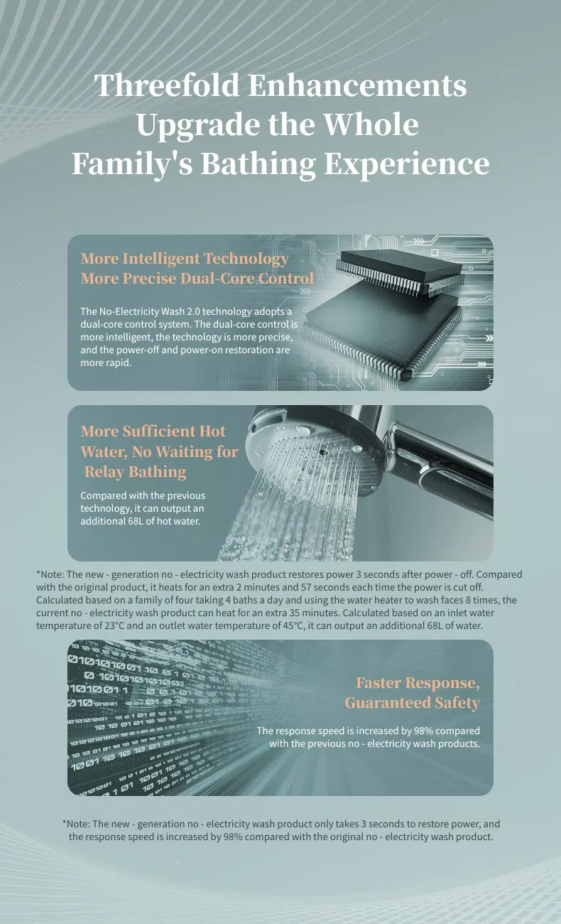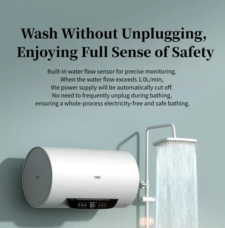 O aquecedor de água elétrico macro SY2 redefine o banho doméstico seguro e eficiente. Em sua essência, está a inovadora tecnologia de lavagem de não eletricidade 2.0-o momento em que a água quente flui, toda a unidade diminui. Isso significa que você nunca precisará desconectar durante um banho, eliminando os riscos de choques elétricos. Também monitora a eletricidade do fio terrestre; Se ocorrer vazamento, ele o alerta instantaneamente. Além disso, a parede anti -elétrica especializada adiciona uma camada de segurança extra, permitindo tomar banho com total tranquilidade.