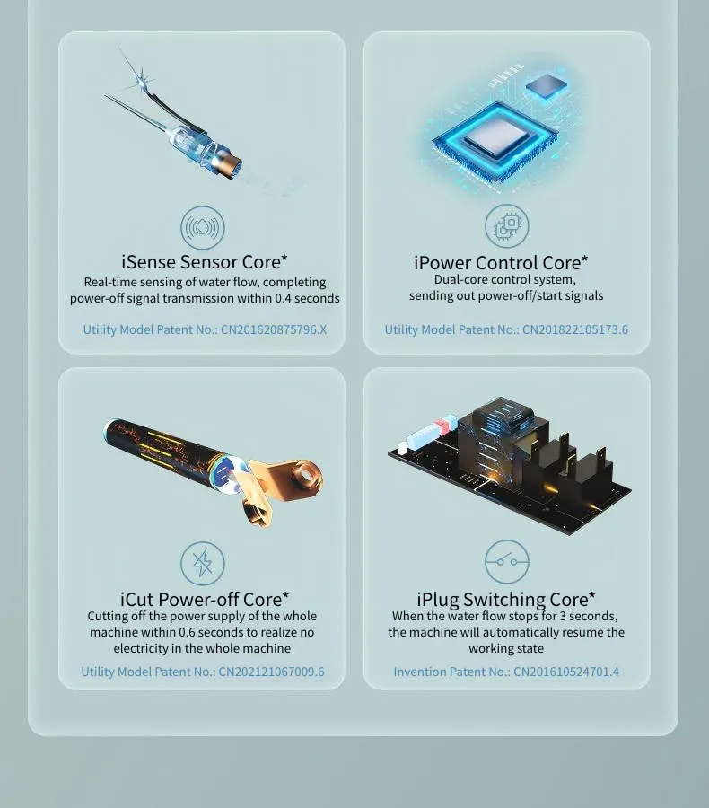 Sensor de fluxo de água embutido para monitoramento preciso. Quando o fluxo de água exceder 1,0L/min, a fonte de alimentação será cortada automaticamente. Não há necessidade de desconectar frequentemente durante o banho, garantindo um processo inteiro - sem eletricidade e banhamento seguro.