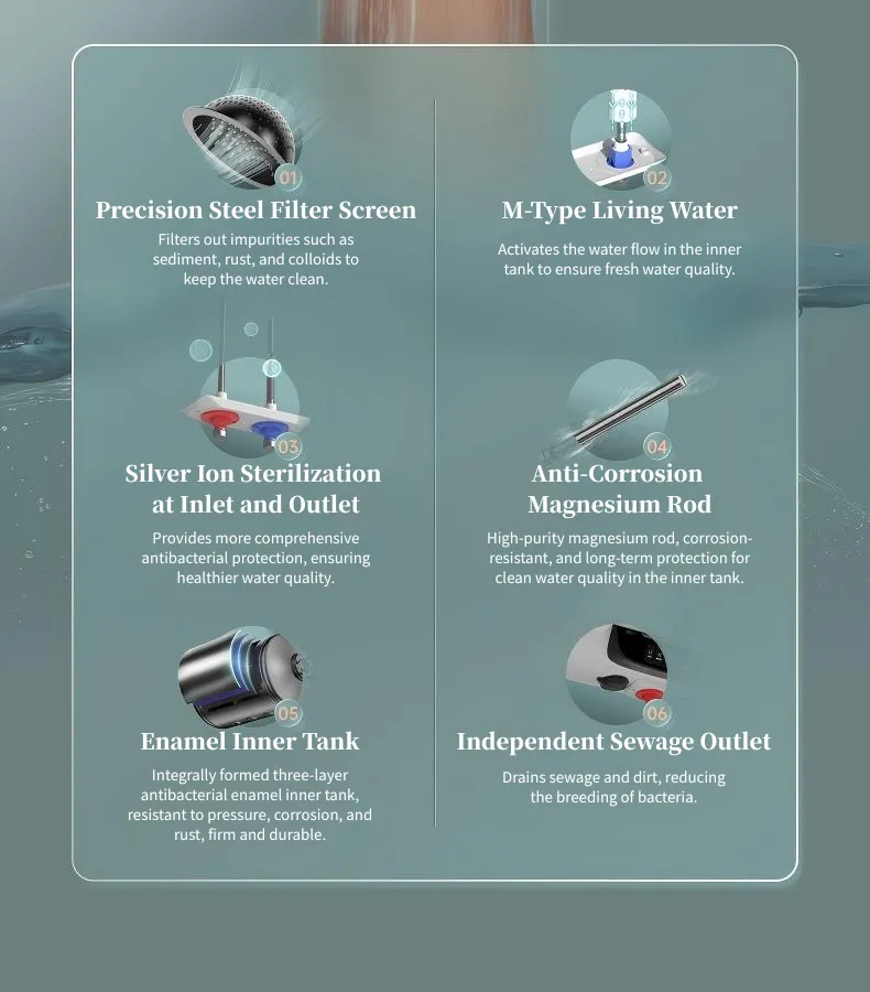 6 - Purificação dobrada: uma haste de magnésio de alta concentração, tanque interno de esmalte, esterilização de prata - íons em enseadas/tomadas, filtro de aço de precisão, circulação de água viva do tipo M e tomada de esgoto independente trabalha juntas para manter a água limpa e livre de escala, bactérias e impurezas.