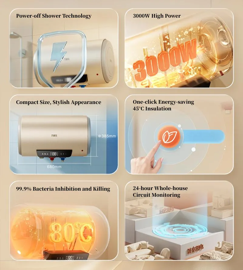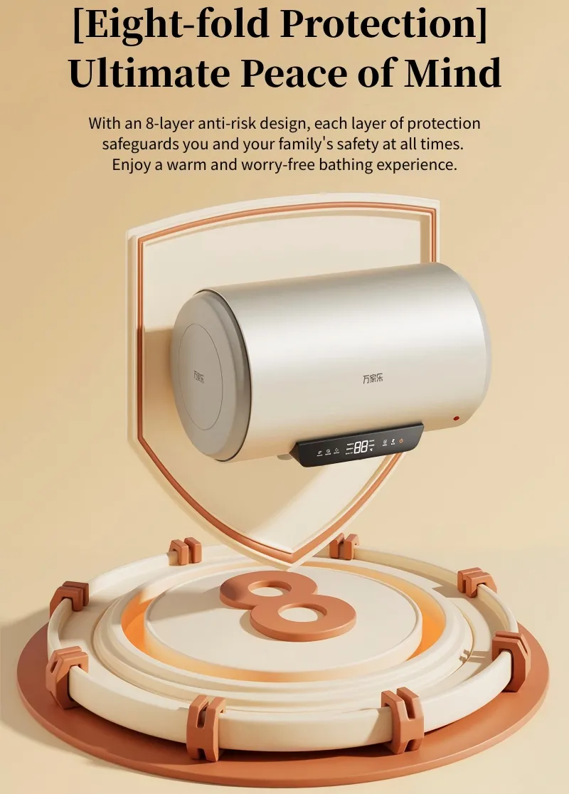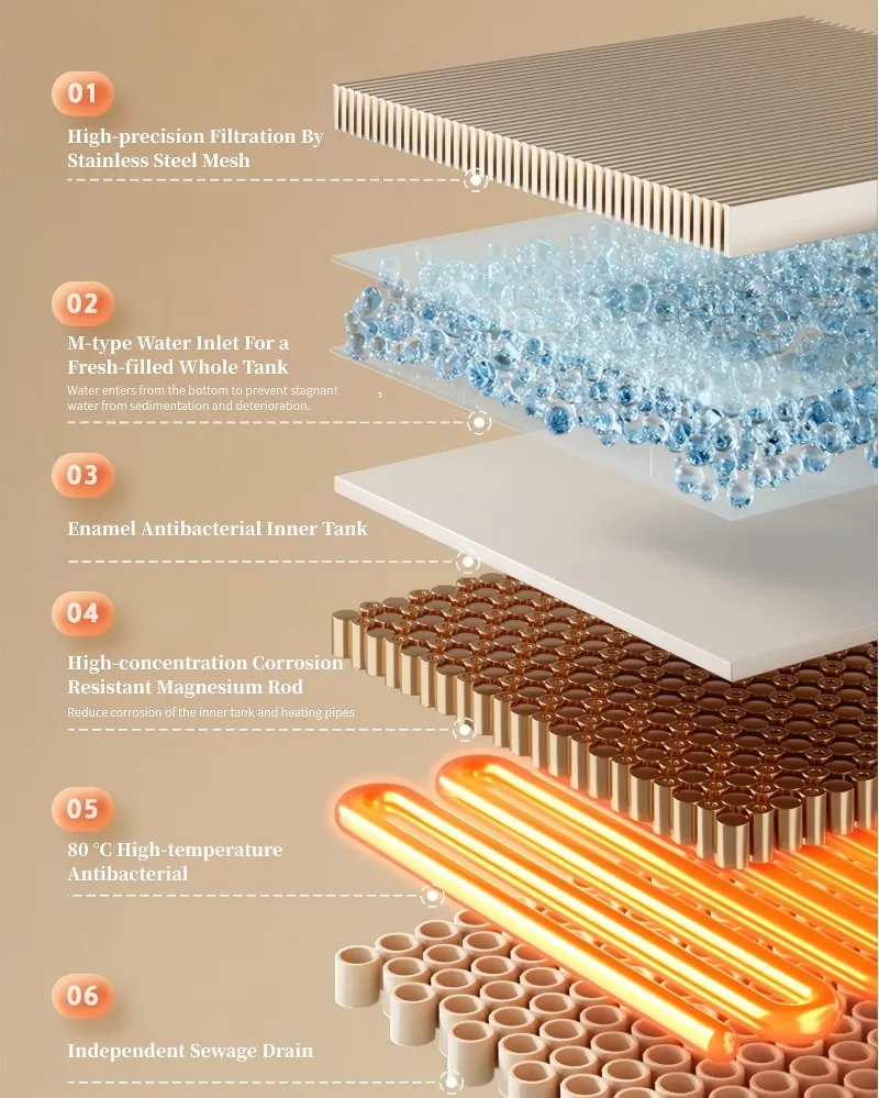 O sistema de purificação de 6 estágios (haste de magnésio de alta densidade, tanque de esmalte, esterilização de alta temperatura de 99,99%, etc.) garante água limpa e saudável. Suas 8 proteções de segurança (antico-congelamento, prevenção a seco, resistência ao raio etc.) e tanque de esmalte durável oferecem confiabilidade a longo prazo.