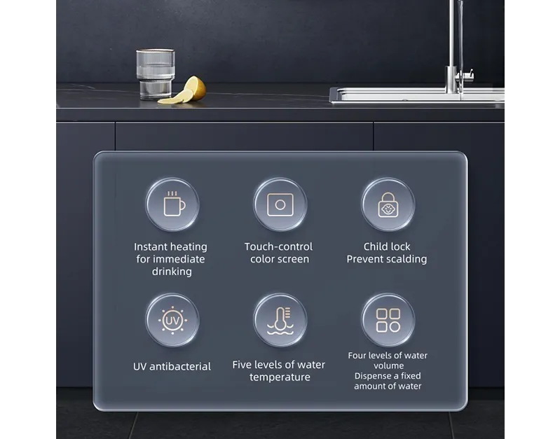 Este dispensador de água premium apresenta um painel de vidro temperado elegante com controle de toque responsivo e botões personalizados para operação personalizada. O poderoso sistema de aquecimento de 2200w fornece água quente instantânea em apenas 3 segundos, oferecendo várias opções de temperatura: temperatura ambiente, 45 ° C, 80 ° C, 90 ° C e ebulição 100 ° C.