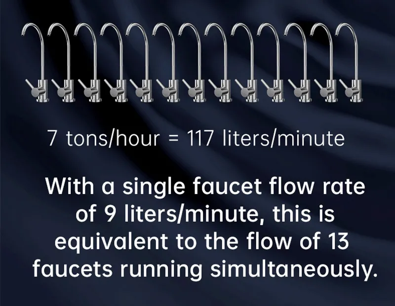 Com uma única taxa de fluxo de torneira de 9 litros/minuto, isso é equivalente ao fluxo de 13 torneiras em execução simultaneamente
