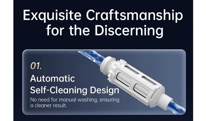 O controle inteligente do botão com a tela LED fornece monitoramento e operação em tempo real. Seu inovador sistema de limpeza automática de 4 modos (incluindo modos de descarga e manual cronometrado) garante desempenho livre de manutenção: