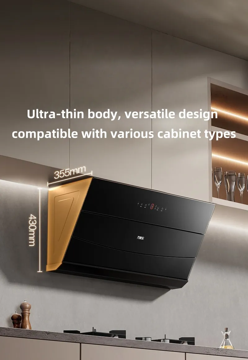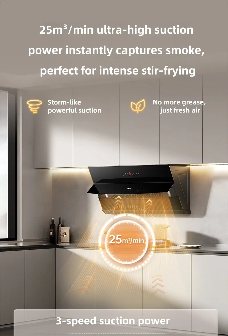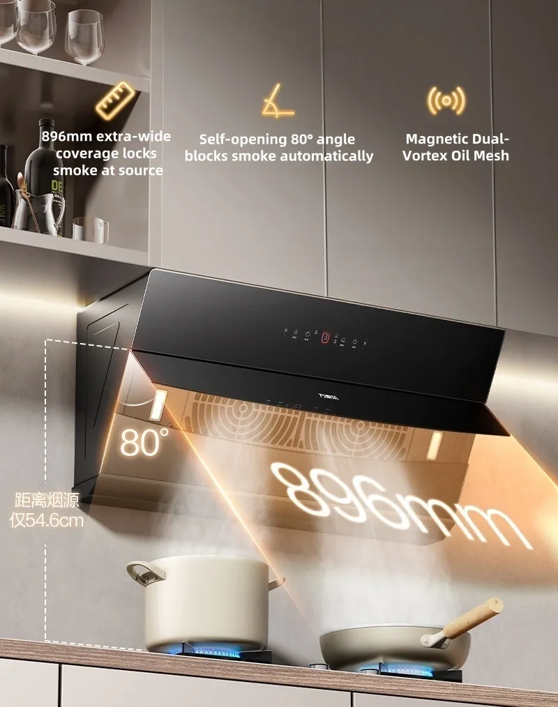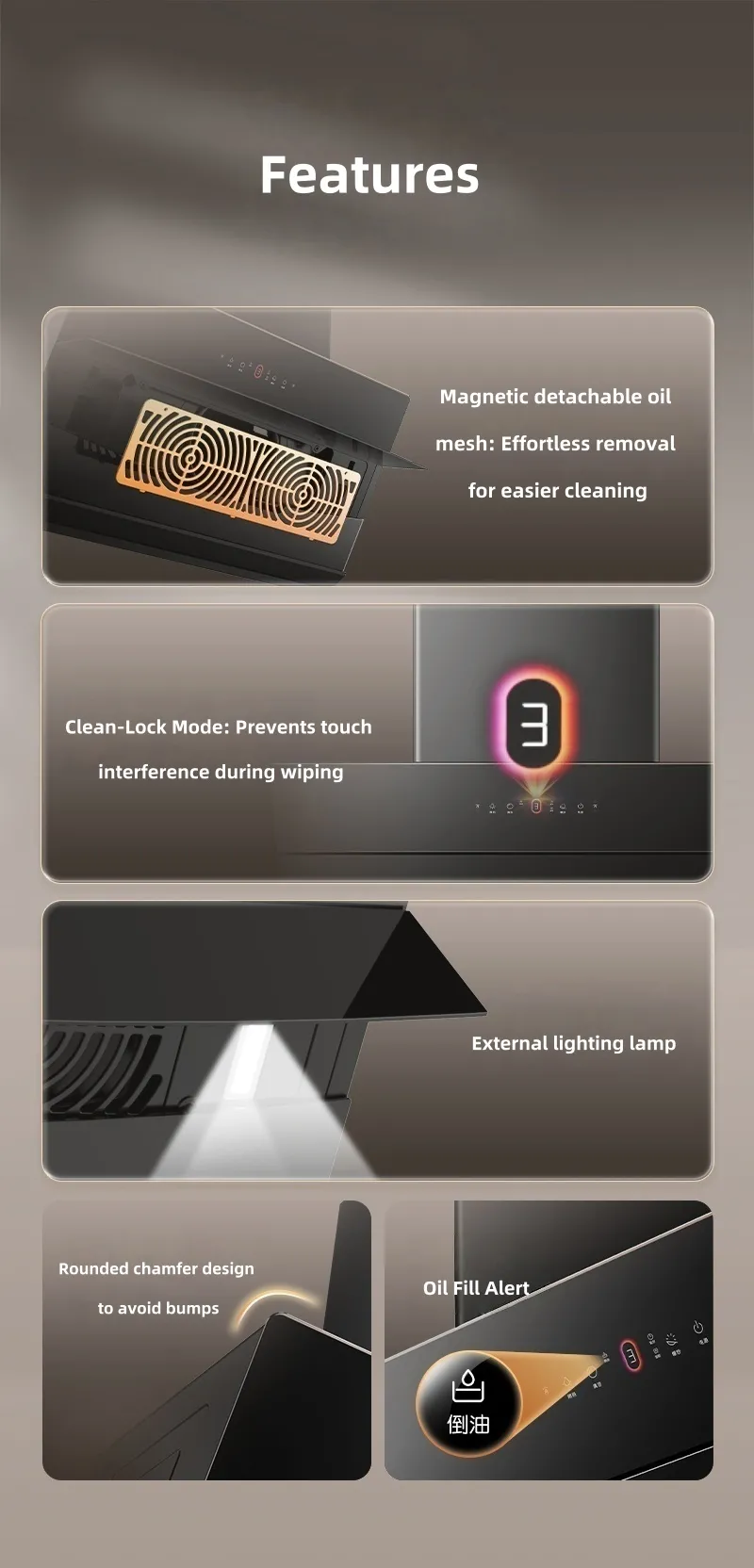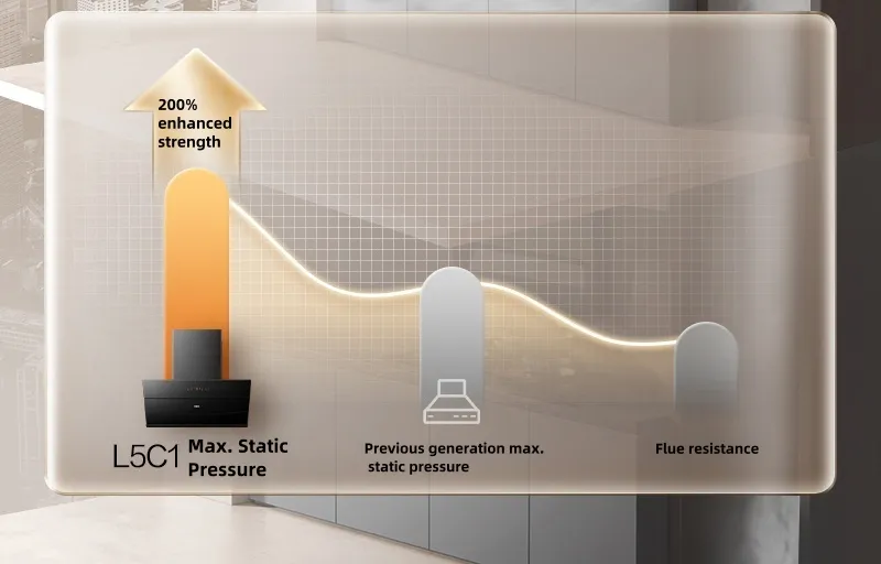 Esse alcance do capô possui um volume de ar alto de 25m³ alto, pressão estática de 500Pa e uma barreira de fumaça de 896 mm para absorção eficiente de fumaça. Com o Smart Linkage, o impulsor nano revestido e a tela de óleo magnético, é fácil de limpar. Ultra-quieto (47dB), economia de espaço (profundidade de 355 mm) e seguro com design arredondado. Um copo de óleo de 1,85L reduz o aborrecimento.