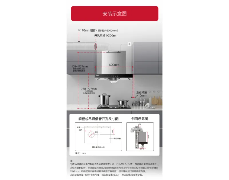 Esta altura de instalação é adequada apenas para fogões a gás. Se instalado acima de um fogão elétrico, ele precisa atender aos requisitos de instalação para fogões elétricos.