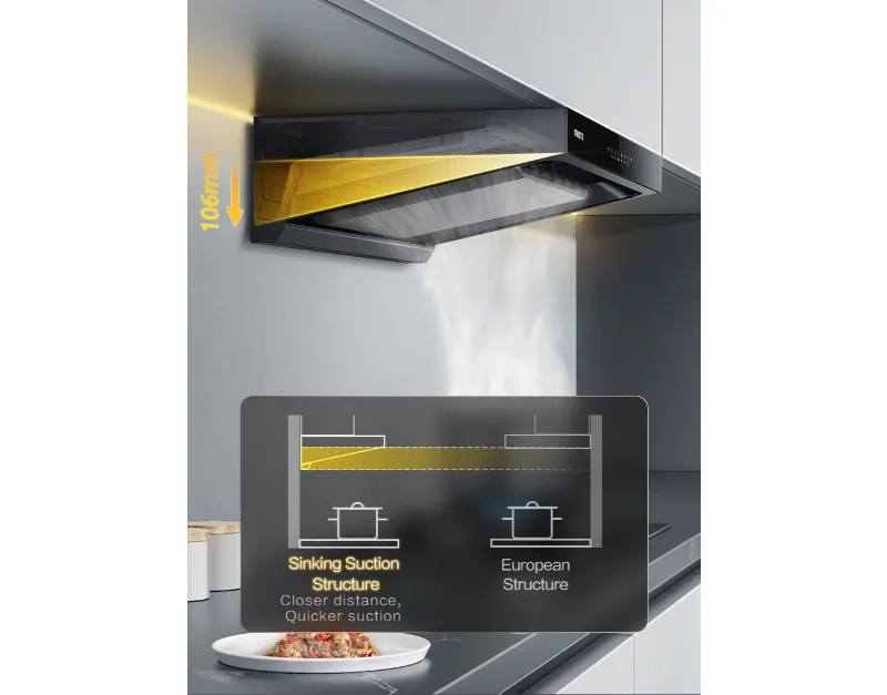A estrutura de afundamento forma uma forte área de pressão negativa e uma ampla área de sucção, cobrindo o fogão a gás, absorvendo rapidamente a fumaça do óleo, de modo que a fumaça de óleo não tem onde escapar