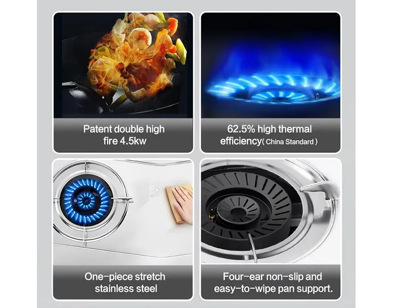 Criados com materiais que não são facilmente deformados ou enferrujados, o fogão garante confiabilidade duradoura, enquanto a cobertura interna de cobre aprimora a distribuição de calor e adiciona um toque elegante. Seu design fácil de usar permite fácil limpeza e manutenção sem preocupações, tornando a cozinha diária sem complicações. Ideal para cozinhas modernas, esse fogão equilibra a eficiência, a segurança e a estética sofisticada, fornecendo uma solução de cozinha confiável e elegante para as famílias.